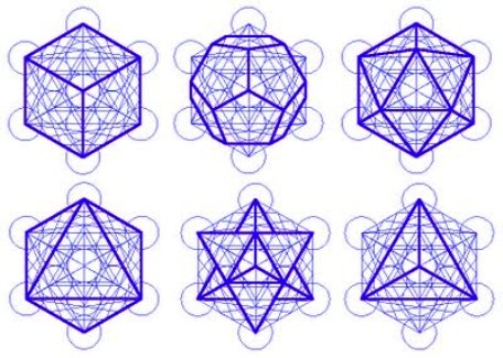 Os cinco sólidos platônicos e os cinco elementos, o cubo (Terra) , dodecaedro (O Aether, o elemento primário universal que dá origem a todos os demais e ao Universo "físico"), icosaedro (Água ), octaedro (Ar), a estrela com dois tetraedros superpostos (a Merkabah) e o tetraedro (Fogo).